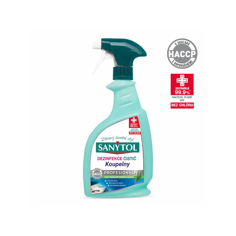 Multifunkční koupelnový sprej 750 ml – odstraňuje vodní kámen a nečistoty, zpomaluje jejich opětovný vznik a dodává lesk, vhodný pro hotely, restaurace, gastro provozy, školy, sportovní zařízení, sanitu, WC, koupelny, obklady, nerez i univerzální povrchy, čistí a dezinfikuje v jednom kroku, v souladu s HACCP, bez agresivních reziduí, dermatologicky testovaný, svěží vůně eukalyptu.