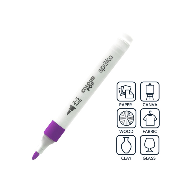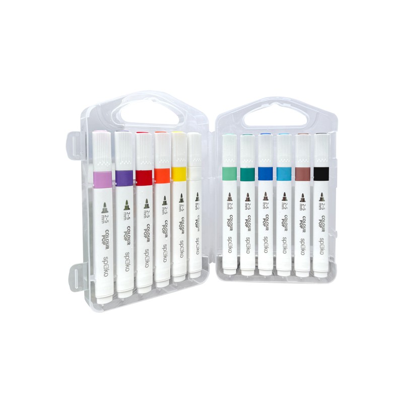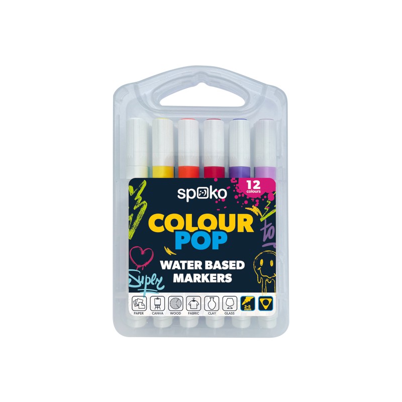 Sada rychleschnoucích popisovačů se složením na vodní bázi. Kulatý střední hrot, který je univerzální a trojhranný tvar pro pohodlný úchop. Odvětrávané víčko, 12 výrazných barev, vhodné na mnoho povrchů – od kamínků, přes canva plátno, textilní materiály, dřevo nebo obyčejný papír. Praktický box - kufřík pro snadné přenášení. Šíře sopy 2-5 mm.