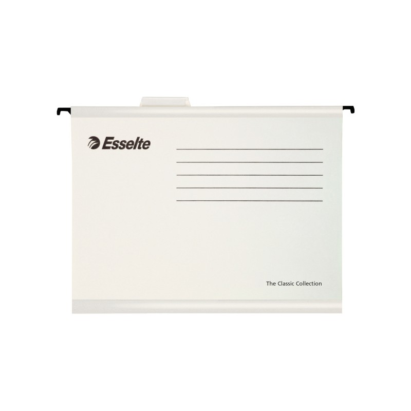 • Esselte Pendaflex Collection A4 Standard. Rozpětí vodících lišt: 330 mm. Kovový závěs. Závěsné zakládací desky A4. Součástí desek je plastový rozlišovač s vyměnitelným papírovým štítkem barevně sladěný s barvou desek. Rozlišovač je možné upevnit v 9 různým pozicích. Lisované dno umožňuje zvýšit kapacitu až na 3 cm. Balení navíc obsahuje 2 cm široký kartónový proužek, který po zasunutí do speciálních otvorů zpevní dno desek.